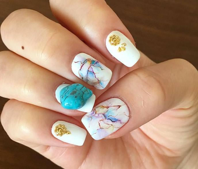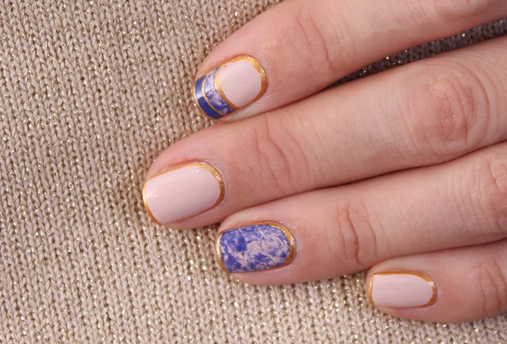 Зубочистку можно заменить тонкой кистью для рисования и буквально перенести рисунок натурального камня на ногти, подобрав соответствующие оттенки. Работать придется прямо на ногте, и для этого не обязательно обладать навыками художника, можно смело перерисовать узор с фотографии.
