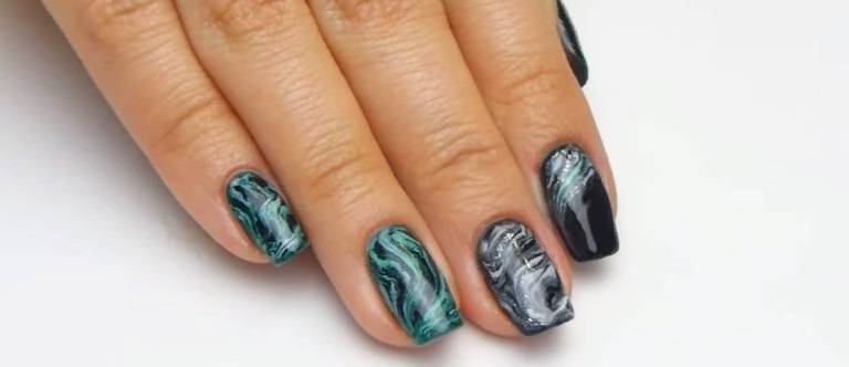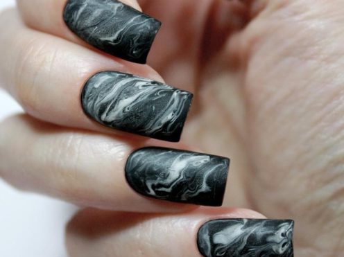 В детстве каждый из нас видел, как красиво размывается водой капля акварели. Вода способна видоизменить рисунок, сделать его воздушным, едва заметным, с нечеткими, туманными линиями. Эффект мрамора соединил в себе подобный дизайн с размытым узором, поэтому вода станет отличным помощником для имитации природного камня на ногтях.