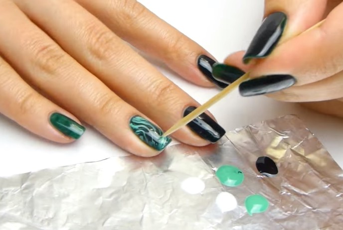 Получить разводы с эффектом мрамора можно посредством бытового приспособления: зубочистки или толстой швейной иглы. Техника выполнения очень проста, и делается намного быстрее, чем предыдущий вариант с пленкой.