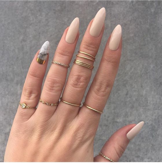 - Если мрамор не на всех ногтях, то на однотонные ногти можно наклеить полоски, украсить их лунками или рисунком.