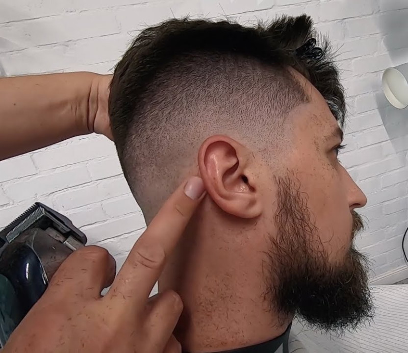 - Затылочную и височную область убирают при помощи машинки, надев на нее короткую насадку. При этом стричь изначально начинают с висков, далее затылок, а потом левый висок.