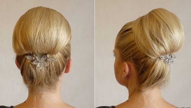 Волосы высокого хвоста закрутите внутрь, образуя валик. Закрепите его невидимками и сбрызните спреем. Аккуратно расправьте сферу, не нарушая ее формы. Снизу украсьте миниатюрной заколкой или крабиком.