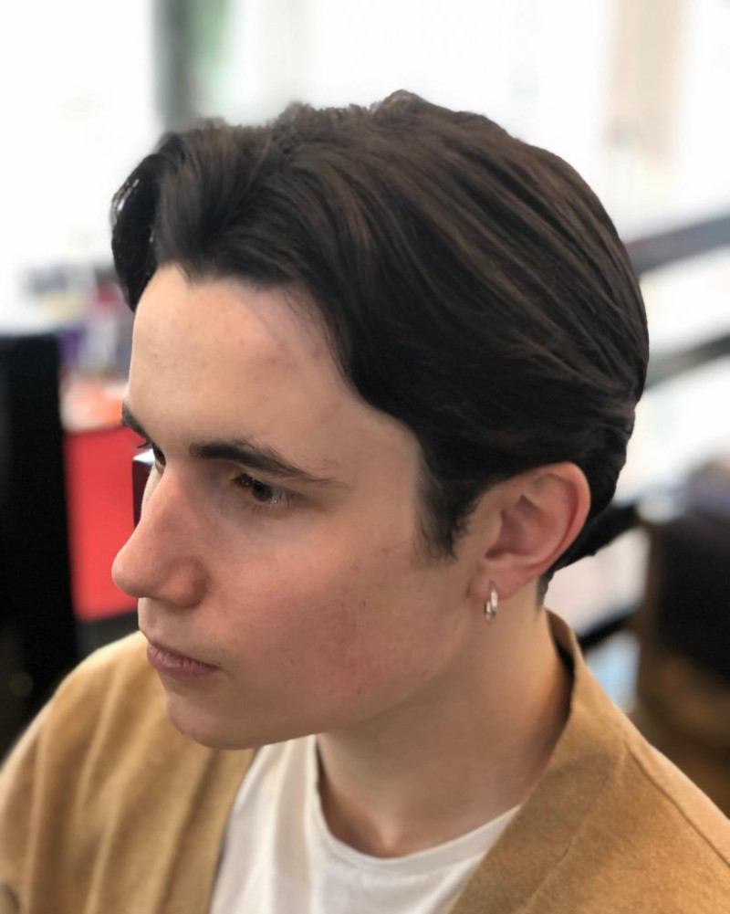 С челкой на две стороны. Это классический вариант, который подходит многим парням. Длина челки остается вариативной — от уровня глаз до подбородка. Выбирайте комфортную длину и наслаждайтесь изящной простотой прически. Стрижка с прямым пробором и обрамляющими лицо прядями делает акцент на глазах и подбородке. С выбритыми висками
