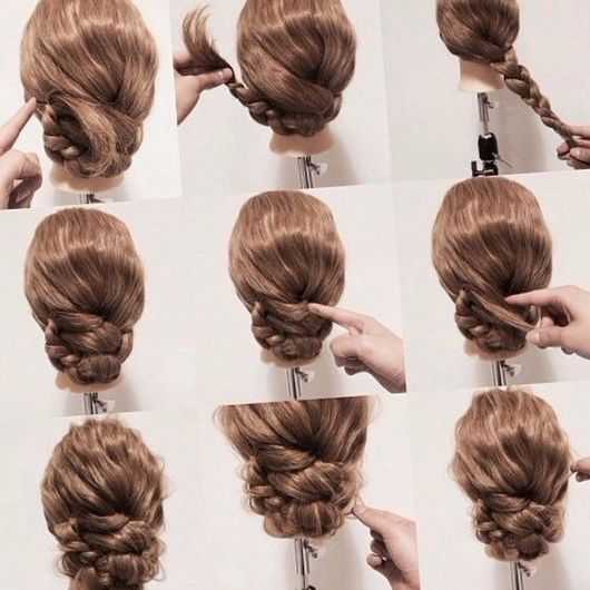 Если вы ищите ответ на вопрос: «Как быстро сделать прическу?», то обратите внимание на корзинку из волос. Разделив волосы пополам, соберите каждую в хвосты на макушке. Заплетите обычные косы и перекрестите их между собой. Поэтапную технику смотрите на фото ниже:
