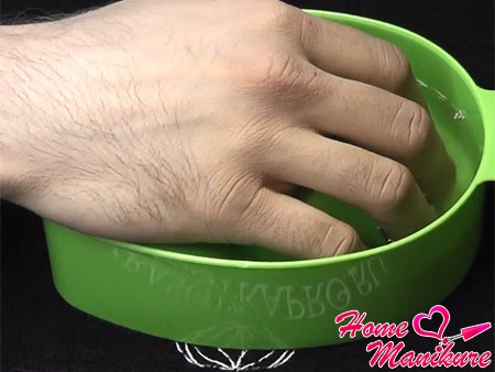 - Размачиваем пальцы в течение 4-5 минут, взяв небольшую мисочку с теплой водой. В емкость следует добавить немного мыла или соли для ванны.