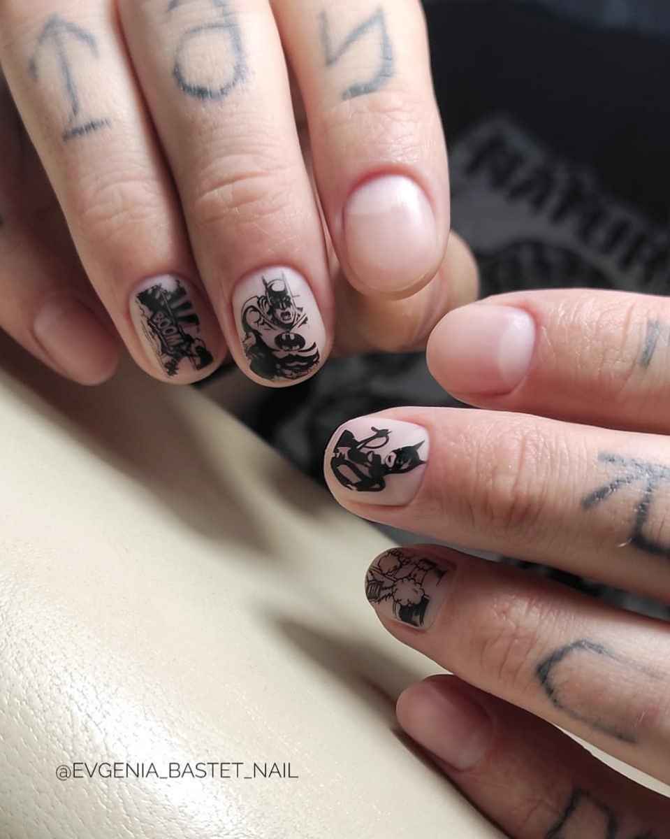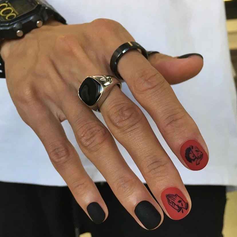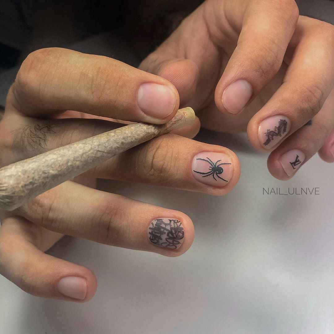 Наиболее часто для дизайна ногтей мужчины выбирают различные черные рисунки и узоры. Какие? Здесь все зависит от предпочтений самого мужчины. Однако, заметим, что подобные рисунки больше напоминают татуировки. Подобный дизайн на ногтях гармонично сочетается с тату на руках.