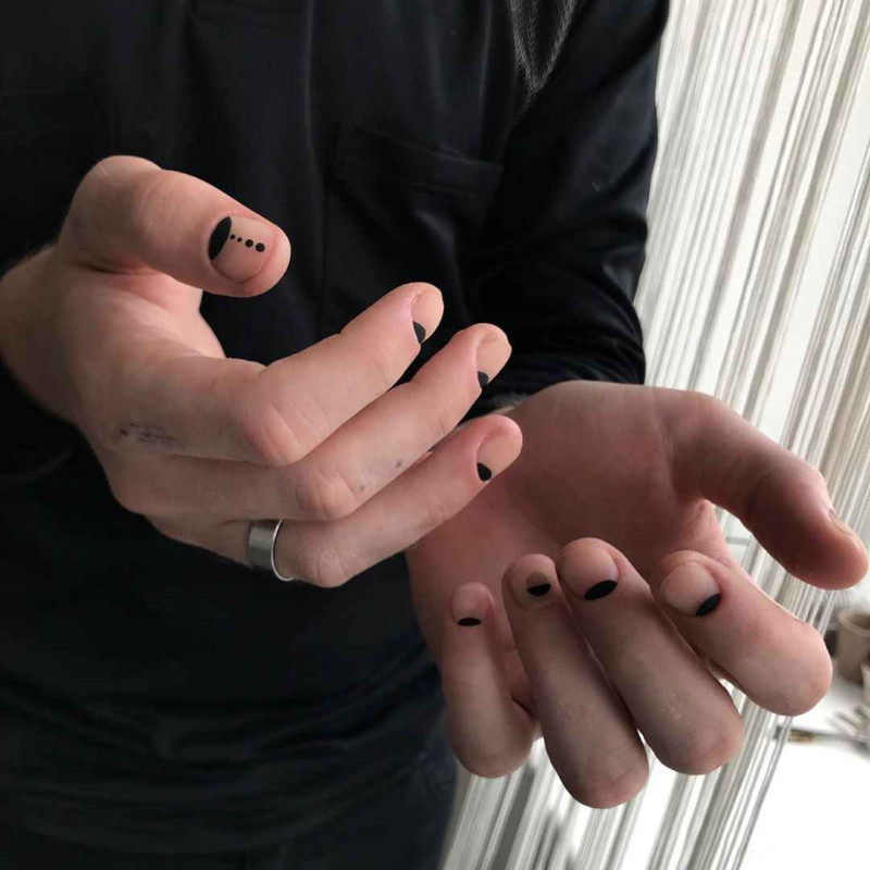 Что есть маникюр? Уход за руками. Что есть гель-лак? Защита ногтевой пластины, самовыражение, дизайн под образ. Если молодой человек решил, что под его образ требуются черные кружочки на ногтях, почему нет? Стал он от этого менее мужественным? Конечно же нет! Все его человеческие качества остались при нем, добавились лишь ухоженные руки.