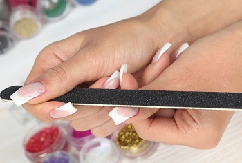 Наконец, завершающим этапом процедуры наращивания ногтей является корректировка формы готового ногтя. Чтобы проделать эту работу, используют пилку с крупным зерном для придания желаемой формы, после чего край необходимо отшлифовать с помощью более мелкой пилки (100/180).