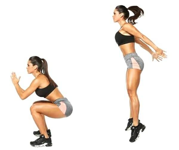 - Выпрыгивания с отягощениями. В качестве дополнительной нагрузки можно использовать гантели либо утяжелители для ног. Сначала вы должны выполнить приседание, а затем совершить быстрое выпрыгивание из этого положения. Сделайте три сета по 15 повторов в каждом.