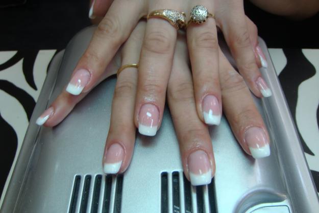 - Экспресс – быстрое наращивание ногтей на типсы-френч. Для этого нужно купить специальные типсы, с прорисованной линией улыбки. Наклеить их на натуральный ноготь и покрыть финишным гелем.