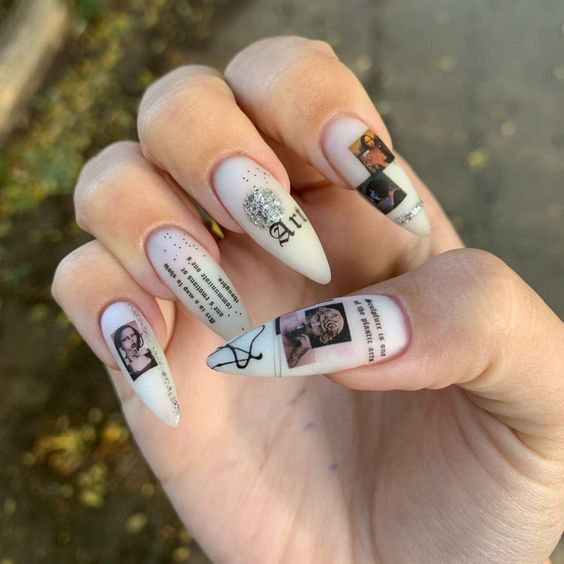 - Фотодизайн – представлен наклейками с реалистичным изображением явлений, предметов, текстов. Такие слайды предварительно вырезаются по контуру ноготка и впоследствии распрямляются на его поверхности при помощи апельсиновой палочки.