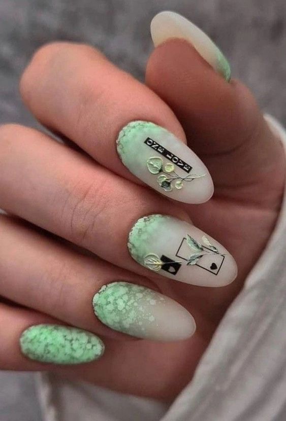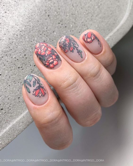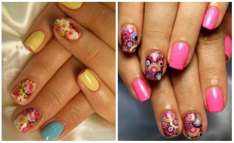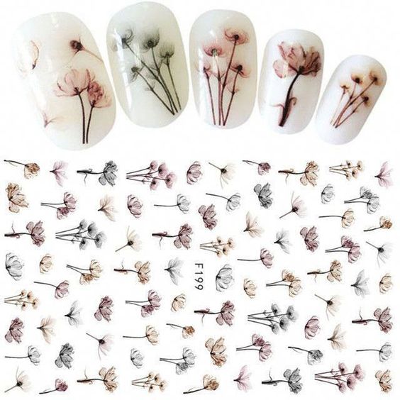 Нейл-арт с полупрозрачными слайдерами напоминает акварельную роспись, что очень модно в текущем сезоне. Лучше подобрать неяркие, нежные наклейки с флористической тематикой, которые смотрятся довольно реалистично.