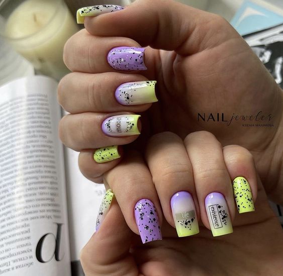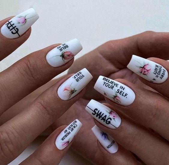 Вручную сделать надпись на ноготке очень сложно, ведь она расплывается и не всегда получается чёткой. Готовые наклейки решат проблему: они выполняются в разнообразных стилях, разными шрифтами и цветами, могут быть мелкими и объёмными.