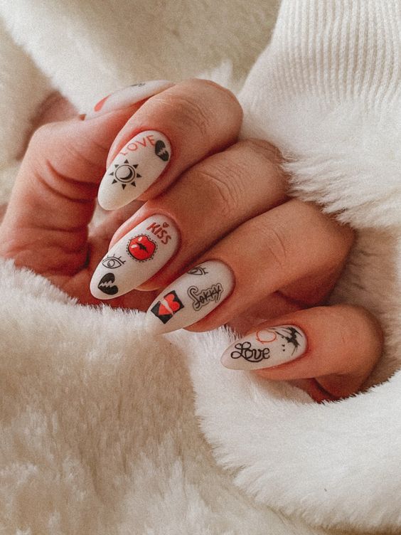 Для декора используют наклейки разных цветов в зависимости от настроения, характера, события. Клеят силиконовые наклейки, пленочные стикеры, слайдеры, узоры, имитирующие французский маникюр или нежное кружево.