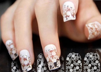 Не менее популярен и классический френч с наклейками – для создания линии улыбки используются кусочки слайдера с оригинальными узорами, которые вырезаются ножницами и приклеиваются на свободный край пластины. Нежно и романтично смотрится французский дизайн с кружевом на кончике ногтя.