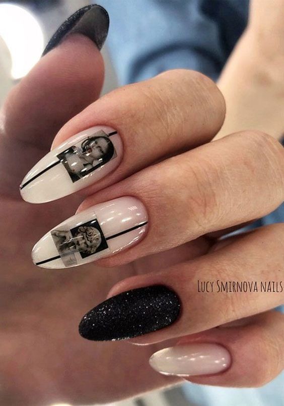 Бархатистое покрытие само по себе считается эффектным и стильным, а в сочетании с слайдер-дизайном становится настоящей модной изюминкой. Чтобы сделать маникюр для праздника, Нового года, можно выполнить его в бело-черной гамме и украсить золотой фольгой.