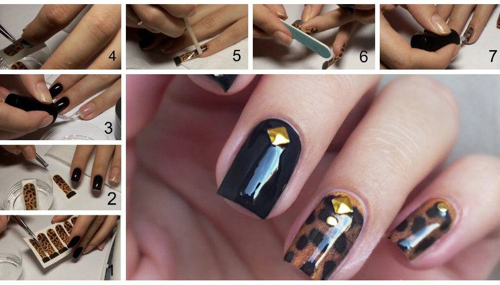 Первоначально, определитесь с дизайном, решите, на всех или на каких-то определенных пальчиках вы хотите сделать рисунок. Те ногти, на которых рисунок не предполагается, покройте лаком гармонично сочетающегося с дизайном наклеек по цвету. После этого пошагово повторите схему: