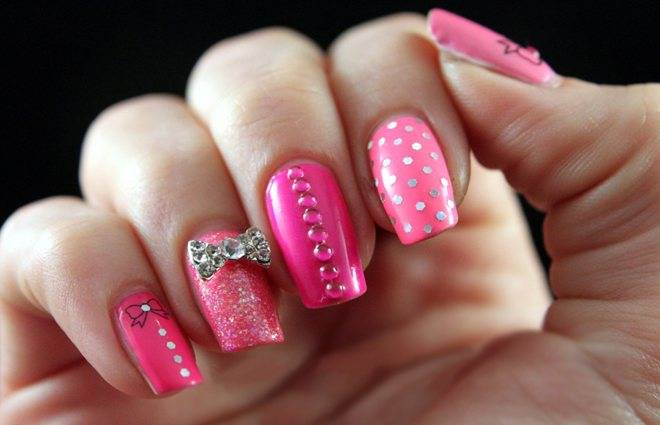 Комбинированный дизайн ногтей со стразами, блестками, объемными украшениями и наклейками