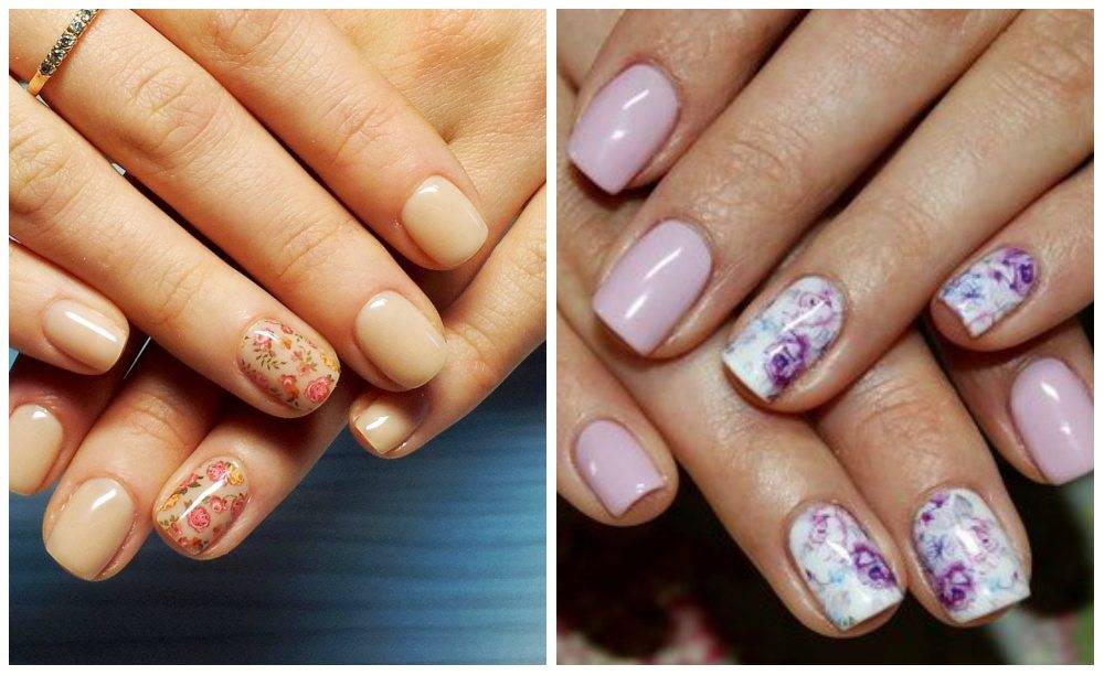 Нейл-арт с полупрозрачными слайдерами напоминает акварельную роспись, что очень модно в текущем сезоне. Лучше подобрать неяркие, нежные наклейки с флористической тематикой, которые смотрятся довольно реалистично.