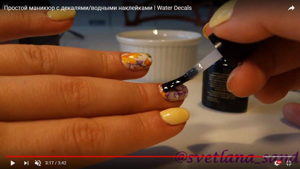 Маникюр с водными наклейками готов. Запечатайте финишным покрытием края пленки, тогда ваш маникюр будет более стойким.