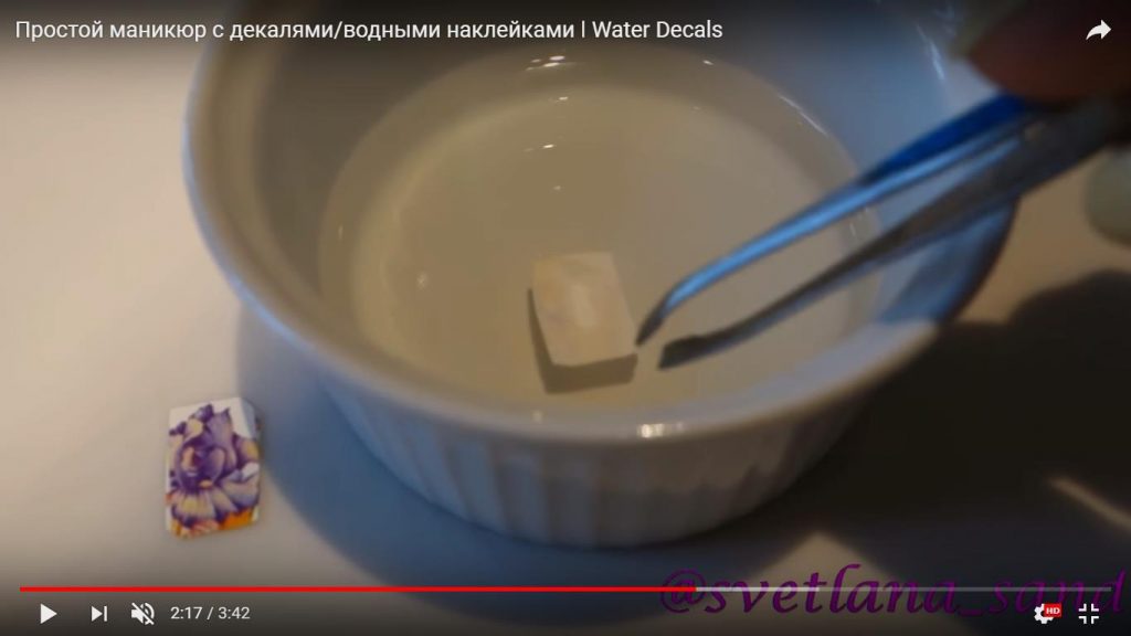 - Наклейки на водной основе для ногтей отправляем в воду, снимаем с подложки.
