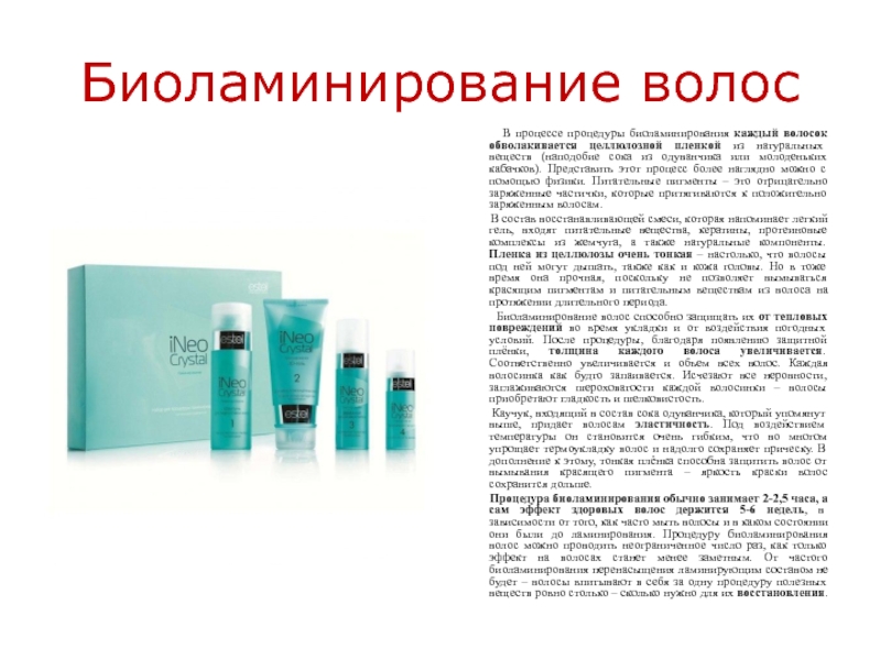 Слайд 8Биоламинирование волос В процессе процедуры биоламинирования каждый