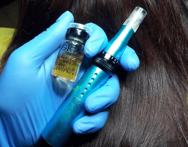 Начинается фракционная мезотерапия с подготовки кожи головы: она очищается, обрабатывается дезинфицирующим раствором Хлоргексидина, наносится обезболивающее средство.
