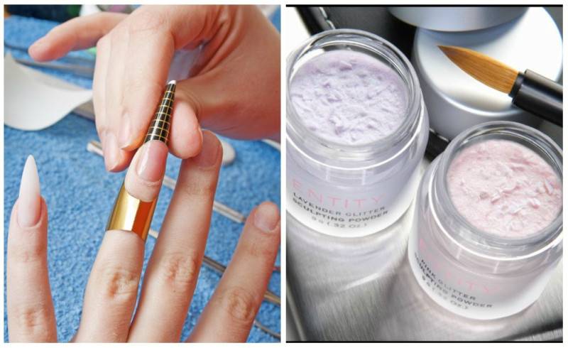 Акрил можно наносить и так, и так. Приклеив типсы на ноготки, их выравнивают ножницами. Границу между природным ногтем и типсой убирают пилочкой, наносят акриловое покрытие, которое моментально сохнет. Умение мастера решает все.