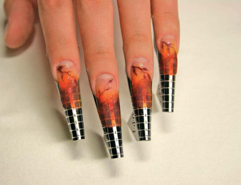 Если на ногте будет выполняться дизайн, то гель нужно нанести как под будущий дизайн, так и после его выполнения и высушивания. Это предаст маникюру высокую устойчивость, а также эстетичный блеск. Кроме того, гель защитит акрил от попадания солнечных лучей, которые могут вызвать пожелтение или потемнение материала, которое особенно заметно при выполнении французского маникюра.