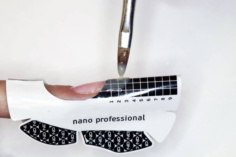 Пора переходить непосредственно к наращиванию ногтей френч. Закрепите специальную форму-шаблон на пальце, как это показано на фото. Сначала аккуратно покройте базовым гелем натуральный ноготь, а затем сформируйте свободный край необходимой формы и длины. Движения кисточки должны быть размеренными и непрерывистыми, чтобы основа будущего маникюра получилась без изъянов. Когда базовая подложка будет готова, отправьте палец в УФ-лампу на 2 минуты для полимеризации.