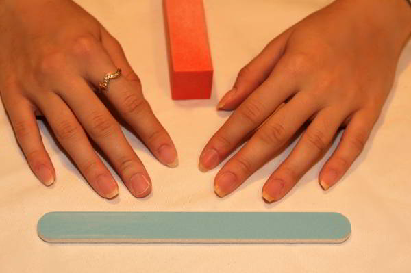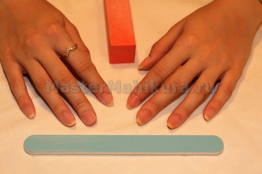 Поверхность ногтей перед нанесением покрытия следует отшлифовать. Верхний слой снимается для более крепкого сцепления с гелем