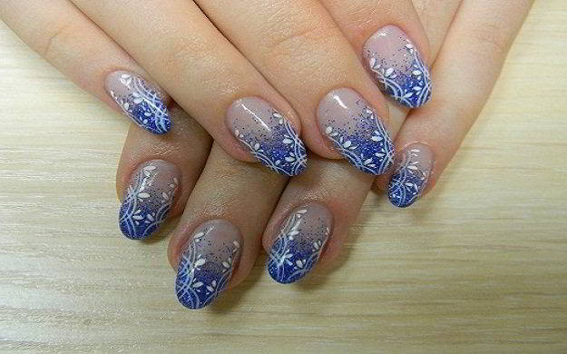 , вот так, не меньше не больше. Оттеняется нежным кружевом, тонкими вензелями узоров. Такой женственный маникюр, трогательный и хрупкий, но заметный.