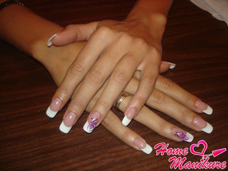 Если вы имеете неплохие навыки художника и уверенно обращаетесь с кистью, то вы можете сделать французский маникюр с рисунком. Не имея навыков и художественной фантазии будет весьма сложно сделать французский маникюр в домашних условиях с каким- то красивым рисунком, поэтому лучше отказаться от такой затеи, а обратиться к мастеру или купить наклейки с интересным дизайном.