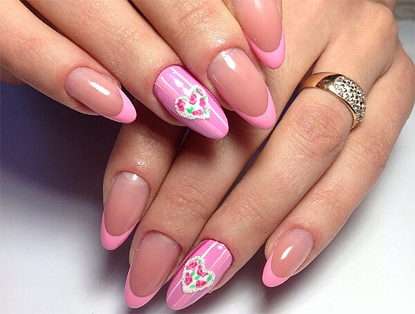 После всего можно наносить первый слой розового геля. Нанесите его от основания ногтя до типсы, для того чтобы выровнять ноготь. После покрытия поместите руку под ультрафиолетовую лампу для закрепления слоя. Держите под ультрафиолетом не больше 2-х минут, т. к. большая длительность влияет на долговечность ногтя.