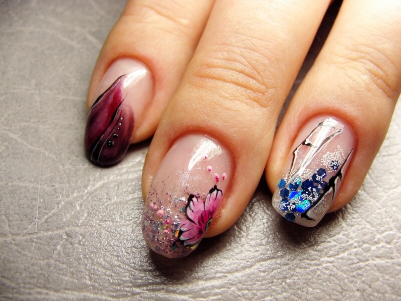 Дизайн с узорами. Не менее востребованным является дизайн с узорами или цветами. При наращивании гелем можно выполнять красивые рисунки цветными гелями тонкой кистью или дотсом.