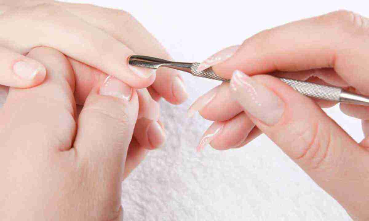 - Зачистите кутикулу, отодвигая её к основанию ногтя.