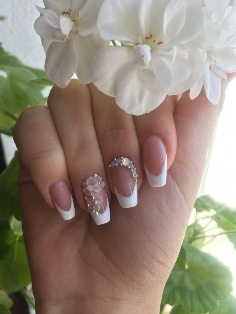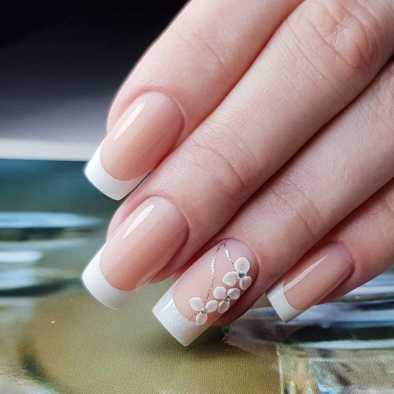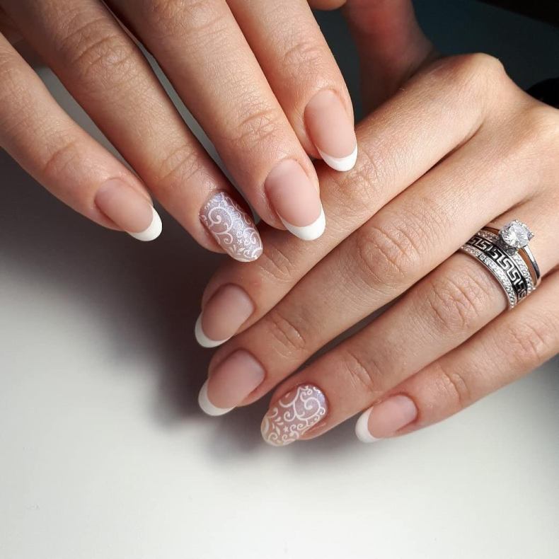 Если длина позволяет, классический френч на свадьбу — беспроигрышный вариант. А если хотите экспериментов, используйте матовый лак.
