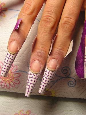 - Приклейте типсы на ноготки, используя специальный клей и крепко прижимая форму, придерживая её сверху и снизу.