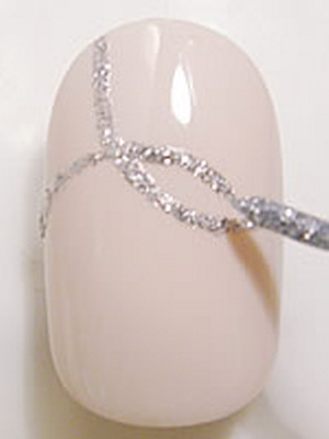 Прозрачный лак нанести на нижнюю часть ногтя, ведя кисть снизу вверх, чтобы граница между лаком и свободной частью получилась немного выпуклой. На искусственных ногтях нужно следить, чтобы край ногтя также был закрашен. Не дожидаясь высыхания лака, приступать к следующему этапу.