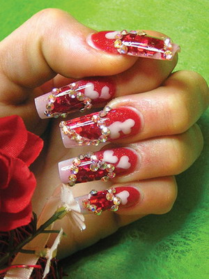 Для создания дизайна понадобятся перламутровый и прозрачный лаки для ногтей, косметический карандаш для ногтей золотого цвета, стразы в виде крупных красных сердец, золотые татуировки для ногтей в виде сердца, блестящая белая пудра, пинцет, иголка или зубочистка.