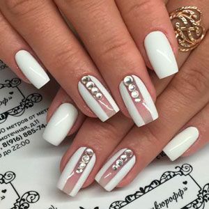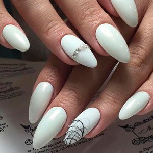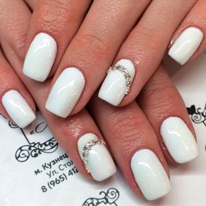 Белый – далеко не нежный пастельный и не универсальный цвет. Холодный снежный оттенок смотрится ярким на ноготках. Использовать его нужно аккуратно – лишь в том случае, если свадебное платье так же имеет чистый белый цвет. При правильном подходе подобное покрытие смотрится дорого и элегантно.