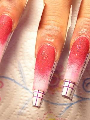 Специальную кисточку слегка обмакивают в акрил до образования небольшого шарика, который затем аккуратно распределяют по ногтевой пластине и шаблону, придавая желаемую форму. Результат покрывают защитным слоем лака.