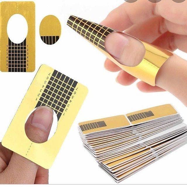 - Одноразовые бумажно-фольгированные или многоразовые пластиковые подложки, в которых имеется специальное отверстие под ноготь. Как правило, на таких формах нанесена специальная разметка для удобства распределения состава для наращивания ногтей. Размер настраивается индивидуально перед нанесением основного состава.