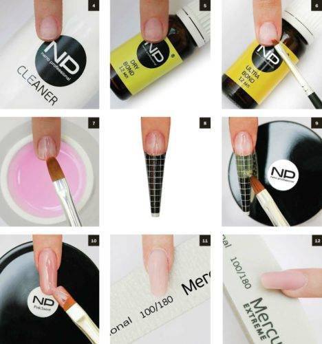 В принципе, для гелевого и акрилового процесса различий практически нет. Разница лишь в моделирующем материале и в названиях всех компонентов для наращивания.