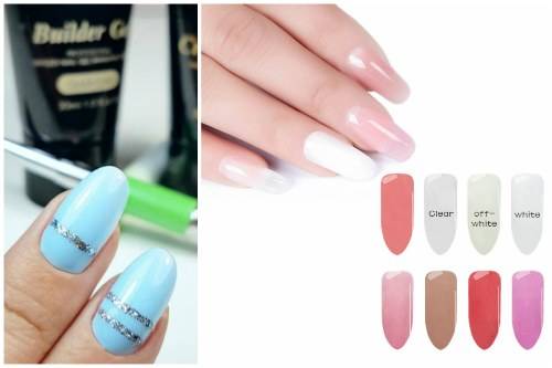 Фактура – эмаль. Можно выбрать разные уровни плотности. В широкой цветовой палитре встречается также коралловый, пурпурный оттенок. Минимальный объем тюбика – 8 мл. Но можно отыскать в продаже и упаковки 60 мл. Такой полигель нет липнет к кисти, поэтому не требует обработки аксессуара специальной жидкостью.