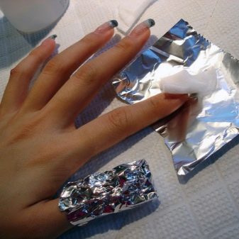 На втором этапе снятие отличается технологией, для акрила и геля она разная. Если это акриловые ноготки, то их вначале размягчают. Для этого предварительно подготавливают 10 ватных тампонов и обильно смачивают их в ацетоне. Тампоны прикладывают на каждую пластинку и закрепляют фольгой, обматывая края пальчиков. Через час акрил приобретёт структуру желе и его нужно сразу же очищать, иначе он повторно затвердеет.