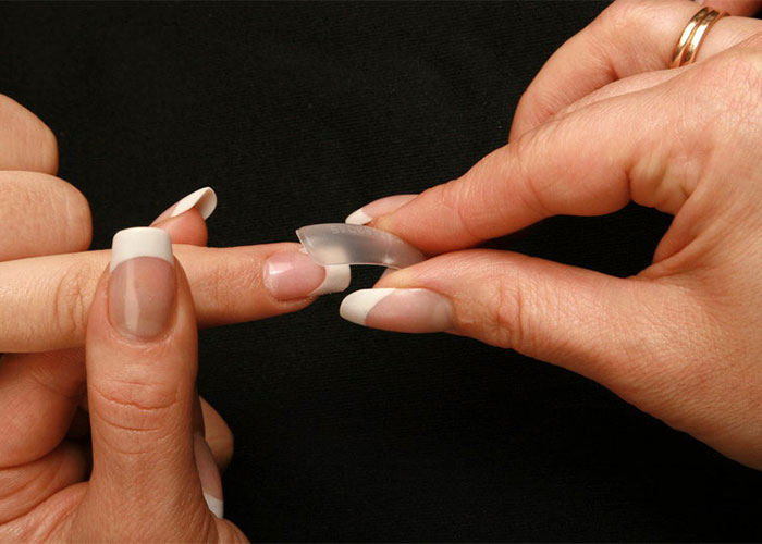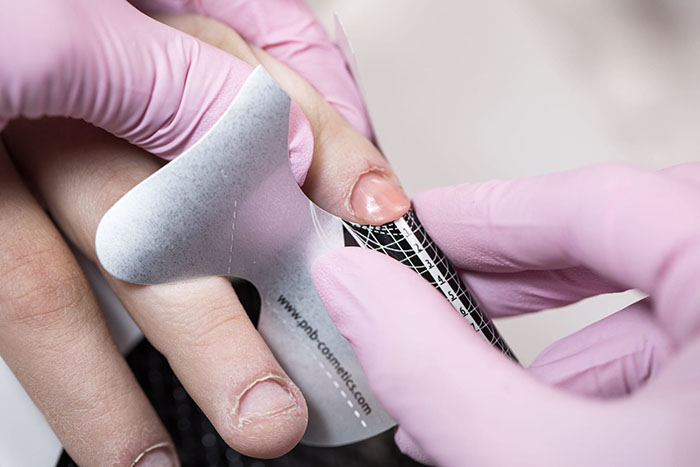 - Теперь можно переходить к использованию формы. Она надевается на палец так, чтобы была расположена точно по углам пластины. Палец при этом сгибается. После того как форма будет верно уложена на ноготь, нужно аккуратно и плотно её прижать, соединив кончики без закрытия, чтобы ноготь не получился неправильной формы. Если на этом этапе неверно расположить форму, то акрил может треснуть после наращивания.