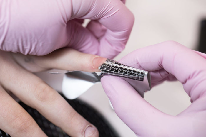 Перед началом наращивания необходима подготовка натуральных ногтей. Их следует отшлифовать и обработать специальной жидкостью для удаления жира. Далее, для создания стройной формы ногтей, нужно использовать верхние формы, которые приклеиваются к натуральной ногтевой пластине. Они имеют разные формы и остаются на ногтях в течение всей процедуры наращивания.