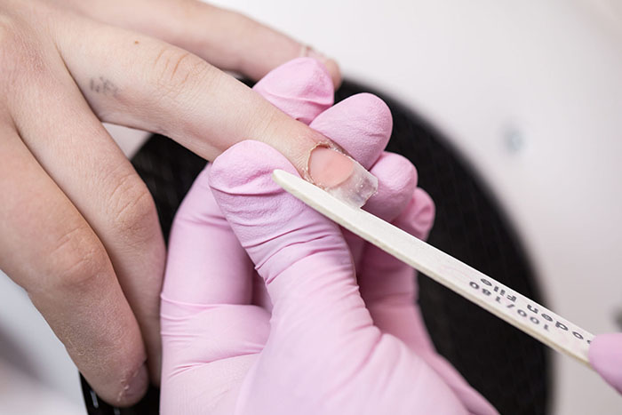 Затем нужно обработать ногтевую пластину. Она должна быть обезжиренной и шершавой, для хорошего сцепления с материалом.