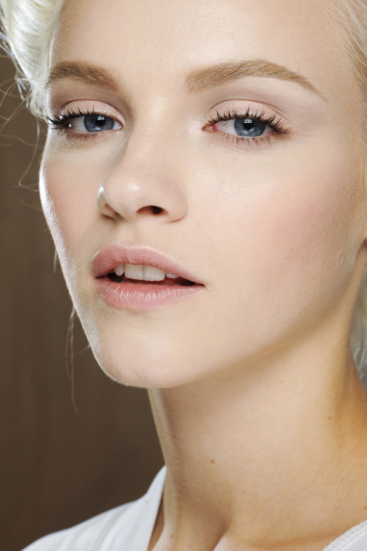 Голубые глаза сами по себе выразительные, поэтому для макияжа nude наносить тени не нужно, достаточно прокрасить ресницы. Также помни про естественность и не перестарайся с тональными средствами. Румяна выбирай персиковых и светло-розовых оттенков. Если у тебя светлые брови – прокрась их карандашом на тон темнее цвета твоих волос.